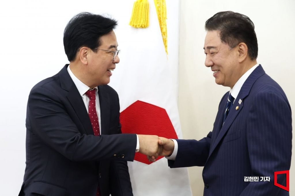 김병기 더불어민주당 대표 직무대행 겸 원내대표(오른쪽)가 17일 국회에서 송언석 국민의힘 원내대표를 예방, 인사를 나누고 있다.