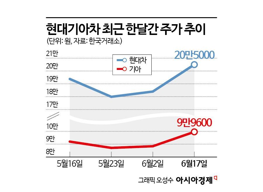 18일 한국거래소에 따르면 이달 들어 현대차 주가는 10.63% 상승했다. 기아는 11.41%, 현대모비스도 13.04% 올랐다. 같은 기간 코스피 수익률(9.36%)을 웃도는 수준이다. 전일 현대차는 1.74% 상승한 20만5000원에 마감했다. 이틀 연속 1%대 상승세를 지속했다. 기아는 2.15% 상승한 9만9600원에 마감, 10만원선 회복을 눈앞에 뒀다. 시총 순위도 회복하고 있다. 이달 초 현대차는 8위, 기아는 10위로 밀려났으나 최근 현대차는 KB금융을 제치고 6위 자리를 되찾았다. 기아도 8위로 다시 올라섰다.
