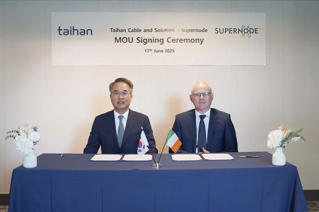대한전선과 슈퍼노드가 차세대 초전도 케이블 개발 관련 MOU(업무협약)를 체결했다(왼쪽부터 송종민 대한전선 부회장, 존 피츠제랄드 슈퍼노드 최고경영자). 대한전선.