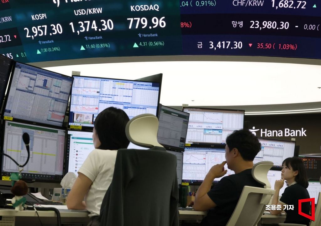 코스피가 3000을 앞두고 중동사태가 고조되면서 등락을 거듭하고 있는 가운데 18일 서울 중구 하나은행 딜링룸 현황판에 코스피 지수, 원/달러 환율이 표시되고 있다.