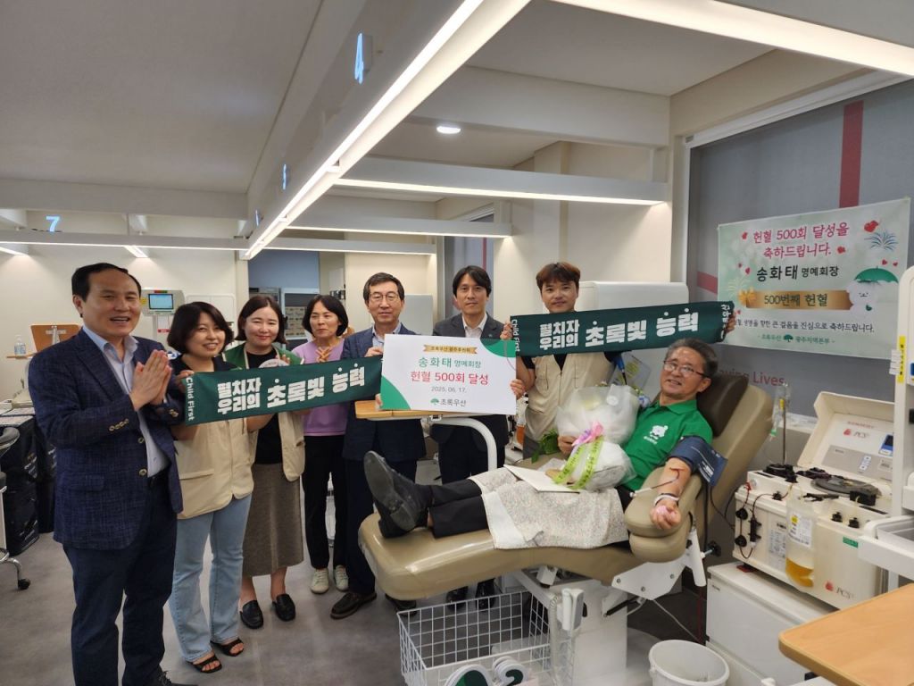 초록우산 광주지역본부가 송화태 초록우산 광주후원회 명예회장이 동구 충장로 헌혈의 집에서 500회 헌혈을 달성했다. 초록우산 광주지역본부 제공