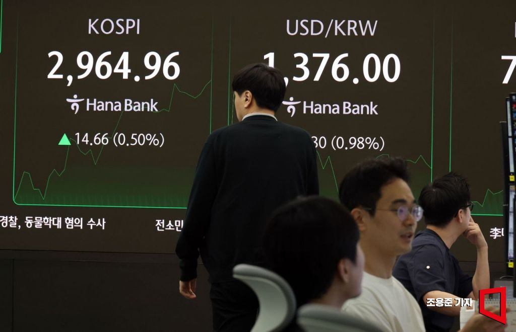 중동리스크가 커지면서 코스피가 3000을 앞두고 숨고르기를 하고 있는 가운데 18일 서울 중구 하나은행 딜링룸 현황판에 코스피 지수, 원/달러 환율이 표시되고 있다. 2025.6.18 조용준 기자
