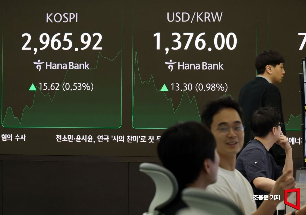 중동리스크가 커지면서 코스피가 3000을 앞두고 숨고르기를 하고 있는 가운데 18일 서울 중구 하나은행 딜링룸 현황판에 코스피 지수, 원/달러 환율이 표시되고 있다.