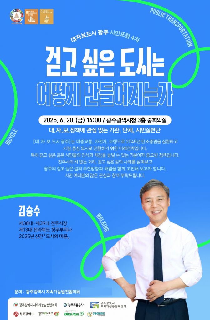 이번 포럼은 광주시가 주최하고 광주지속가능발전협의회, 광주교통공사, 광주도시재생공동체센터가 공동 주관한다. 대중교통·자전거·보행 중심의 '대자보 도시 광주'에 대한 시민들의 인식과 체감을 높일 수 있도록 전주시 사례를 통해 광주의 '차 없는 거리', '걷고 싶은 길' 추진 방향과 해법을 논의하기 위해 마련됐다.