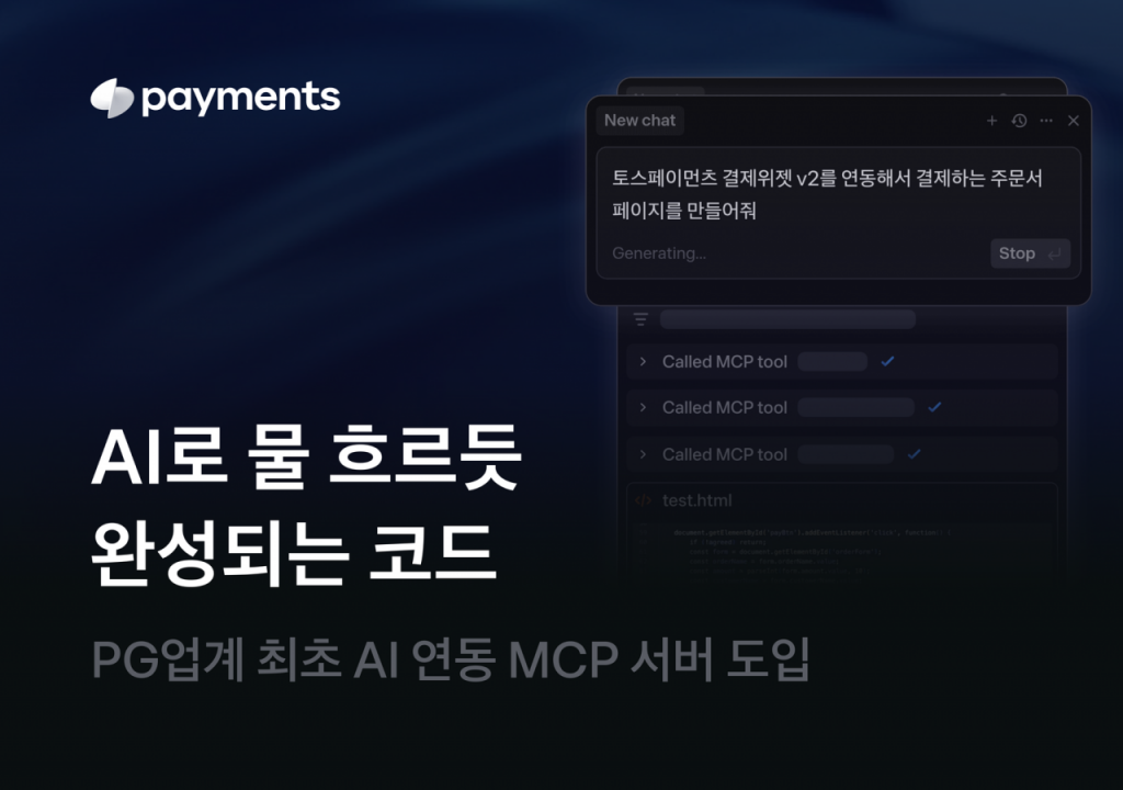 토스페이먼츠는 전자지급결제대행(PG) 업계 최초로 모델 콘텍스트 프로토콜(MCP) 서버를 도입해 인공지능(AI) 기술 기반 결제 연동 환경을 갖췄다고 18일 밝혔다. MCP 서비스를 도입하면서 최대 석 달 걸리던 결제 연동 작업을 10분 만에 끝낼 수 있게 됐다고 설명했다.