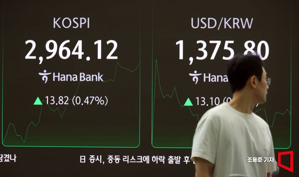 중동리스크가 커지면서 코스피가 3000을 앞두고 숨고르기를 하고 있는 가운데 18일 서울 중구 하나은행 딜링룸 현황판에 코스피 지수, 원/달러 환율이 표시되고 있다. 2025.6.18 조용준 기자