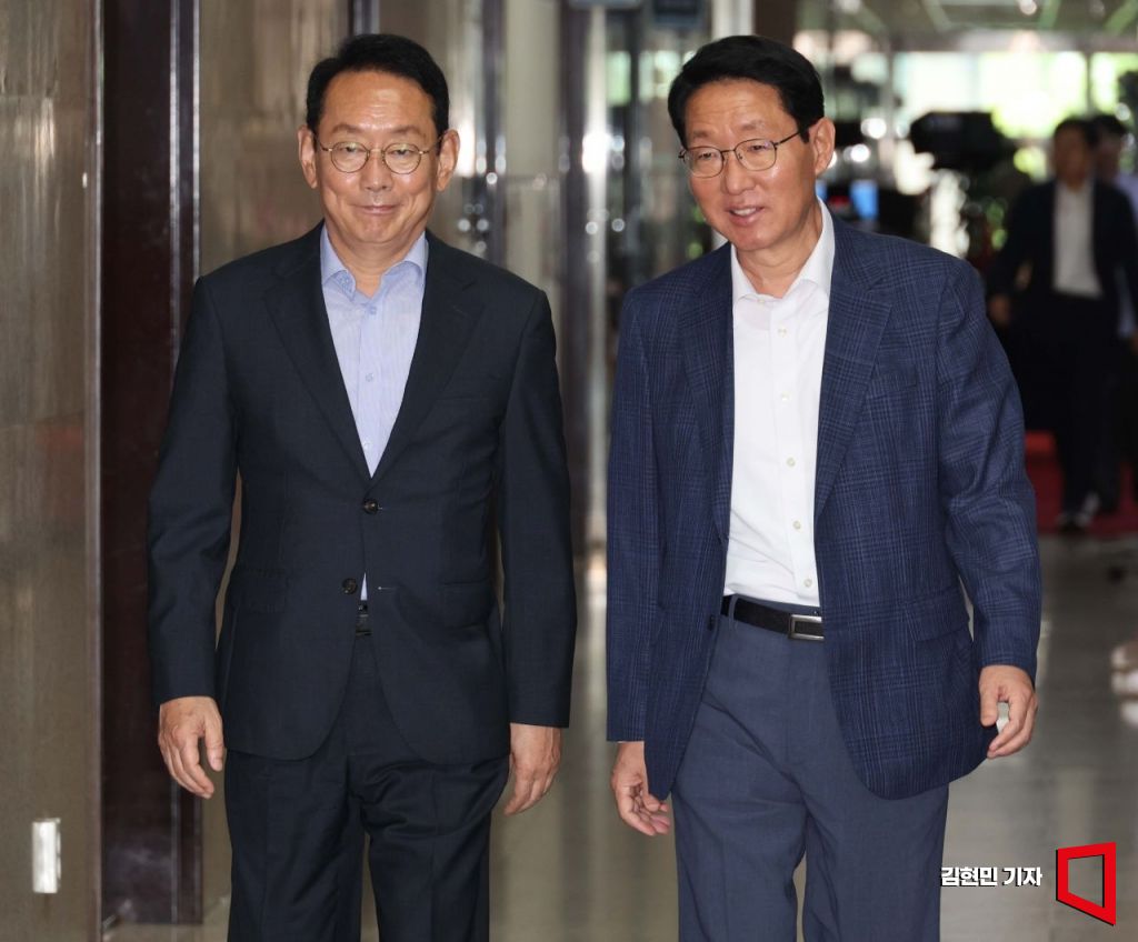 김도읍(왼쪽), 김상훈 국민의힘 의원이 18일 국회에서 열린 송언석 원내대표 주재 4선 이상 의원 간담회에 참석하고 있다.