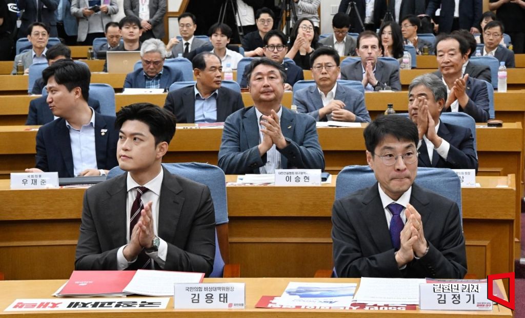 김용태 국민의힘 비상대책위원장이 18일 국회 의원회관에서 열린 ‘군 공항 이전사업’국정과제 채택을 위한 국회 정책세미나에 참석해 김정기 대구시장 권한대행 등과 박수치고 있다.
