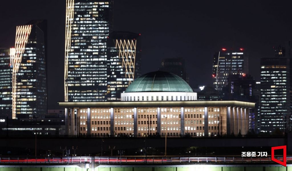서울 여의도 국회의사당 뒤로 증권, 금융가의 빌딩들이 환하게 불을 밝히고 있다. 조용준 기자