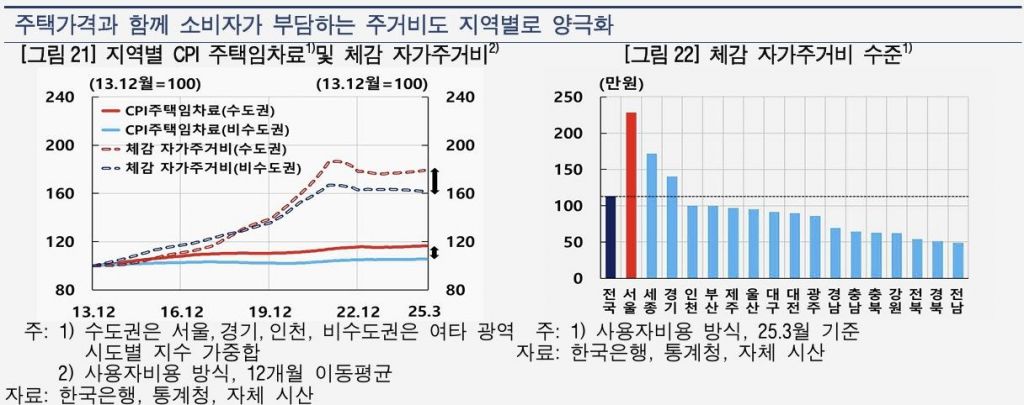 한은은 "주택가격 양극화로 인해 누적된 주거비부담이 실제 소비 여력을 줄이는 요인으로 작용하고 있는 만큼, 소비 부진 완화를 위해서도 주거비를 안정시키는 것이 중요하다"며 "주택건설 측면에서는 비수도권 주택건설을 통해 건설투자를 견인하는 부양책에는 보다 신중할 필요가 있다"고 강조했다. 이어 "수도권은 가계부채 누증, 비수도권은 신용위험이 증대되고 있는 점은 지역별로 차별화된 거시건전성 관리가 요구됨을 시사한다"고 덧붙였다.
