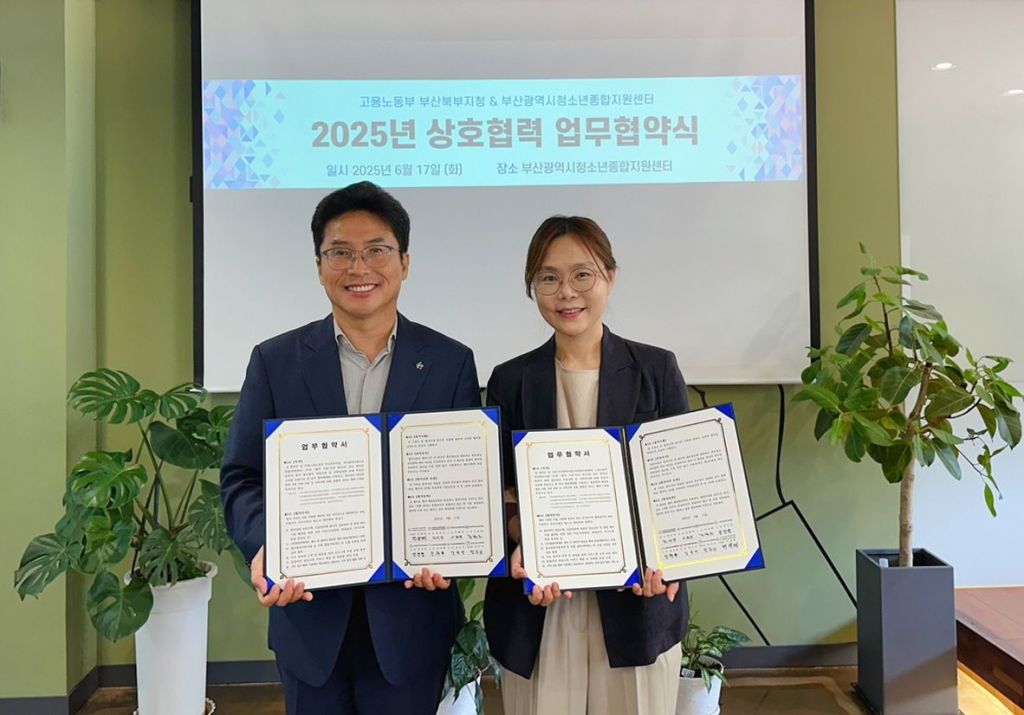 고용노동부 부산북부지청 민광제 지청장(왼쪽부터), 부산광역시청소년종합지원센터 최선경 관장이 협약을 맺고 있다.