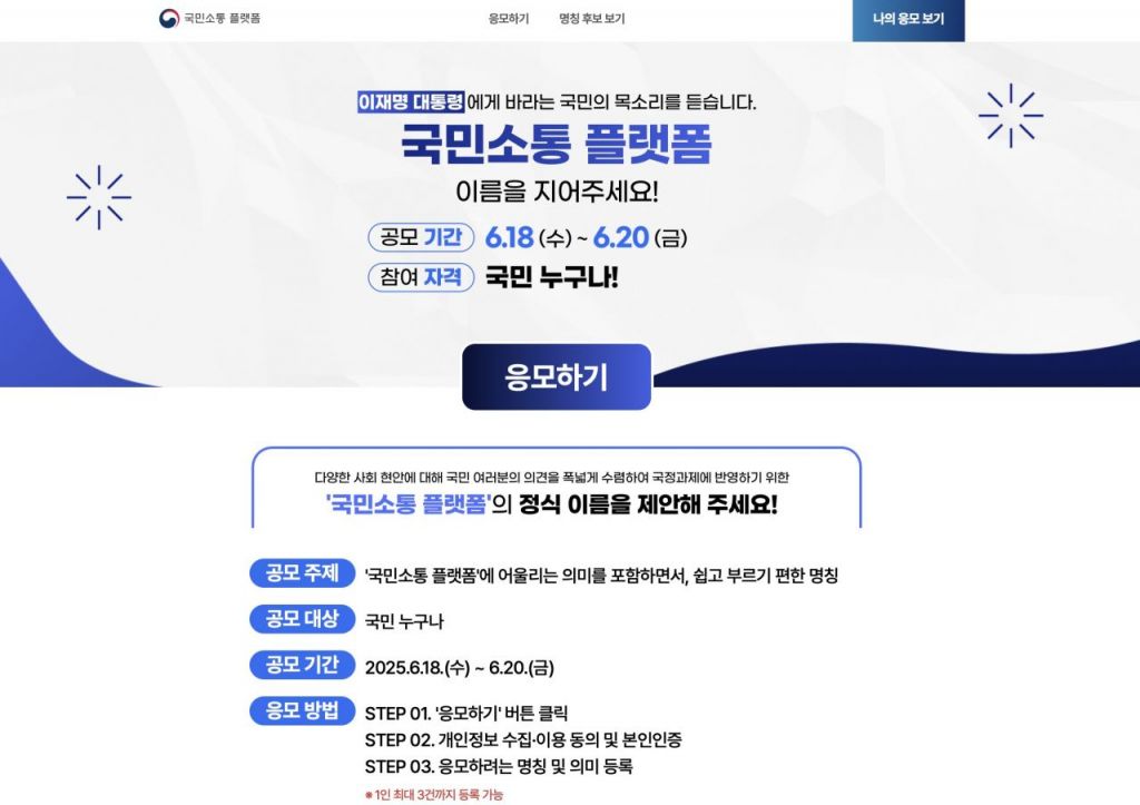 소통 플랫폼 개통에 맞춰 '이재명 대통령에게 바란다'(가칭)로 운영되는 소통 플랫폼의 정식 명칭을 공모한다. 오는 20일까지 3일간 국민 의견을 받을 예정이다. 제안된 명칭 중 전문가 심사 등을 통해 10여건의 후보를 선정하고, 추후 온라인 국민투표 결과를 반영해 결정할 예정이다.
