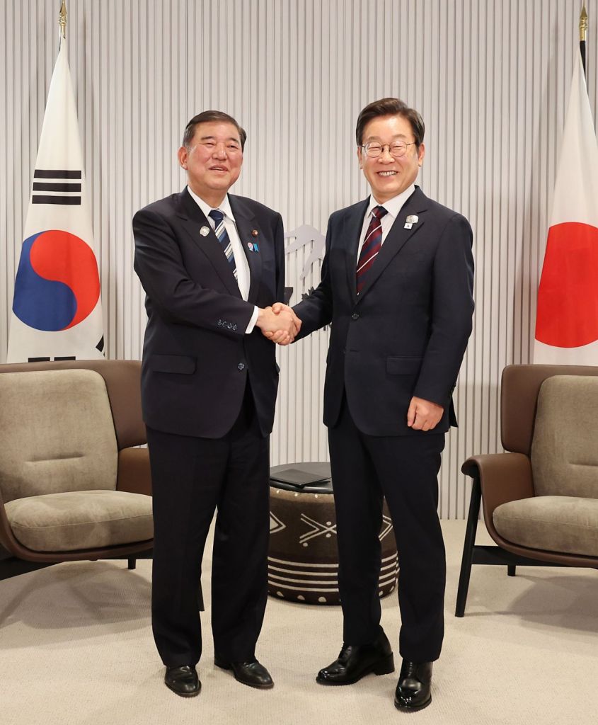 이재명 대통령이 17일(현지시간) 캐나다 앨버타주 캐내내스키스 주요 7개국(G7) 정상회의장에서 열린 한일 정상회담에서 이시바 시게루 일본 총리와 악수하며 기념촬영을 하고 있다. 연합뉴스