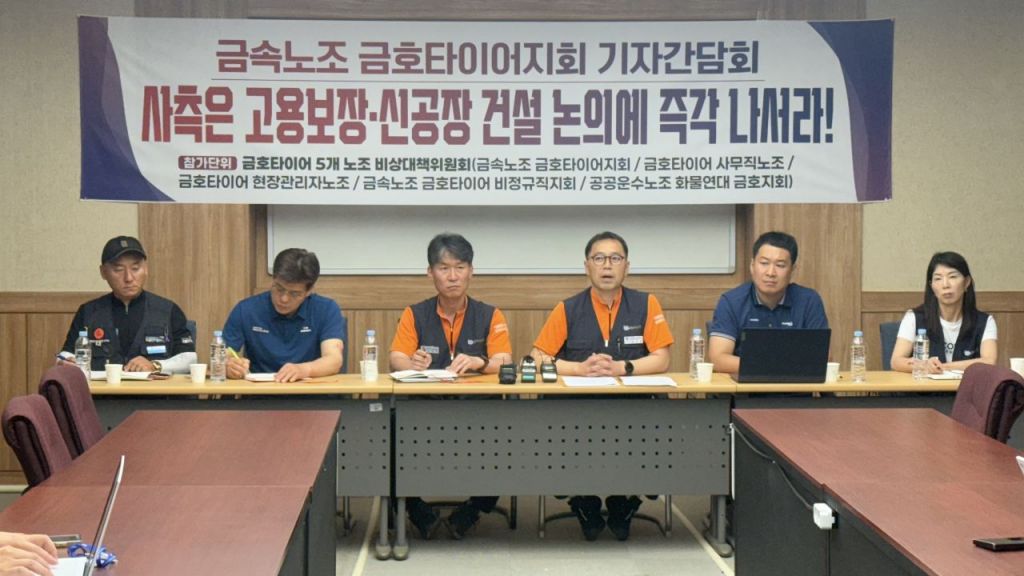 전국금속노조 금호타이어지회는 18일 광주공장에서 기자간담회를 열고 "사측은 고용보장과 신공장 건설 논의에 즉각 나서야 한다"고 밝혔다.