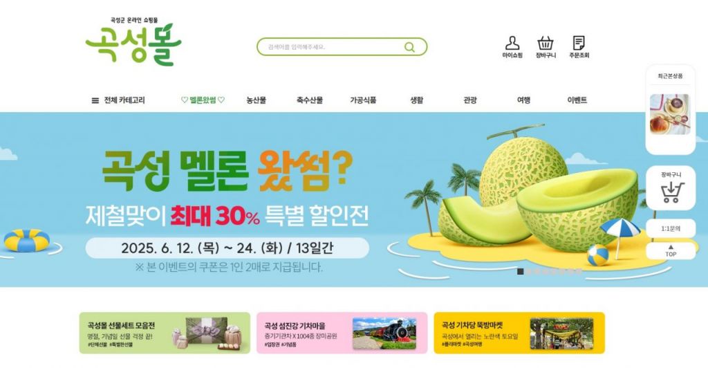 현재 곡성몰에서는 매주 수요일 진행되는 '수퍼딜 30%' 이벤트와 오는 24일까지 운영되는 '곡성멜론 제철맞이 30% 특별전'이 소비자들에게 큰 호응을 얻고 있다. 또 카카오톡 친구 추가 시 2,000원 할인 쿠폰을 제공하며, 리뷰 작성 고객에게는 최대 1,000원 할인 쿠폰을 지급하는 등 풍성한 혜택을 제공 중이다.