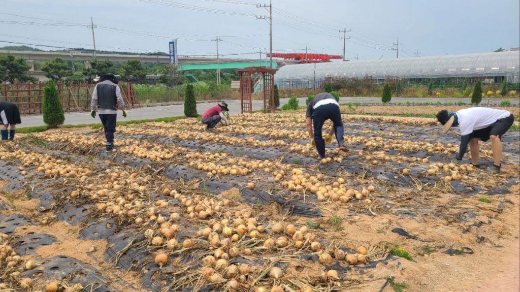 함평군 귀농어귀촌 체류형지원센터 교육생, 양파 수확 사진.