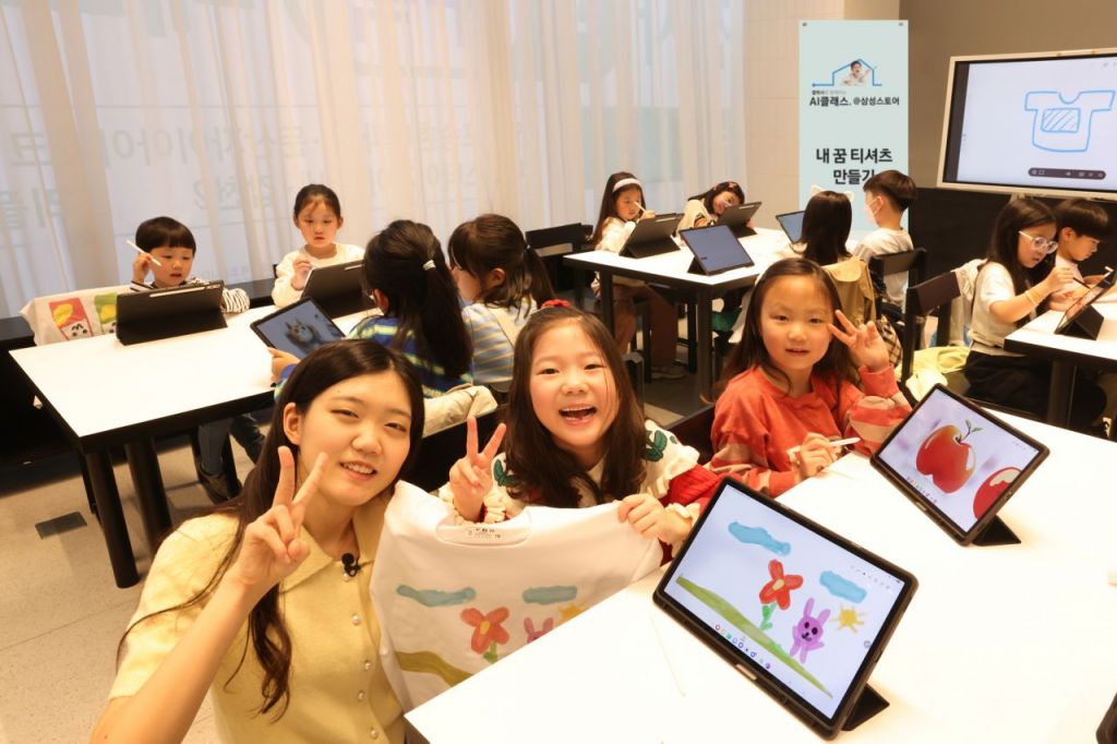 삼성스토어 대전에서 진행된 '갤럭시와 함께하는 AI 클래스 @삼성스토어'에서 아이들이 갤럭시 AI를 활용한 티셔츠 만들기를 체험하는 모습. 삼성전자 제공