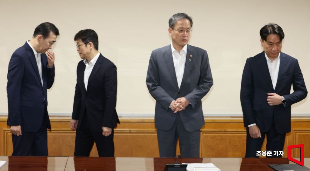 19일 서울 중구 은행회관에서 열린 거시경제금융회의에 참석한 이형일 기획재정부 장관 직무 대행(오른쪽 두번째)이 유상대 한국은행 부총재(왼쪽 두번째), 이형주 금융위원회 상임위원(오른쪽), 이세훈 금융감독원 부원장이 기념촬영을 마치고 자리로 이동하고 있다.