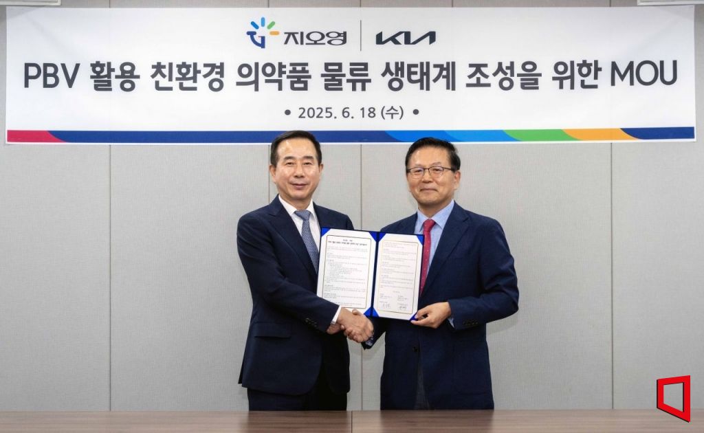 기아는 18일 지오영 본사에서 지오영과 PBV 활용 친환경 의약품 물류 생태계 조성을 위한 업무협약(MOU)을 체결했다. 왼쪽부터 정원정 기아 국내사업본부장 부사장, 유광열 지오영 대표. 기아