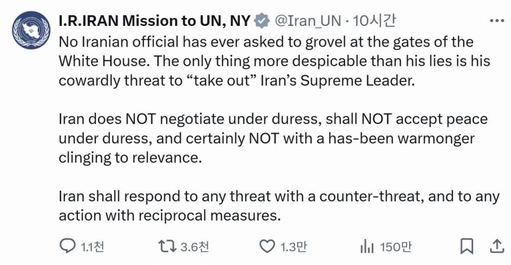 이란 대표부는 이날 사회관계망서비스(SNS)인 엑스(X·옛 트위터)에서 "이란의 그 어떤 관리도 백악관 문 앞에서 구걸하려 한 적이 없다"며 이같이 밝혔다.