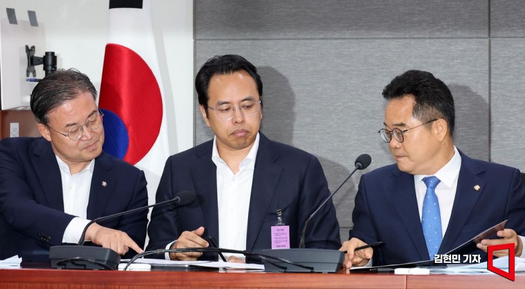 19일 국회 의원회관에서 열린 더불어민주당 을지키는민생실천위원회, 배달앱(배달의민족) 사회적 대화기구 중간합의문 발표 브리핑에서 민병덕 을지로위원장(오른쪽)과 김범석 우아한형제들 대표(가운대)가 합의문에 서명하고 있다.