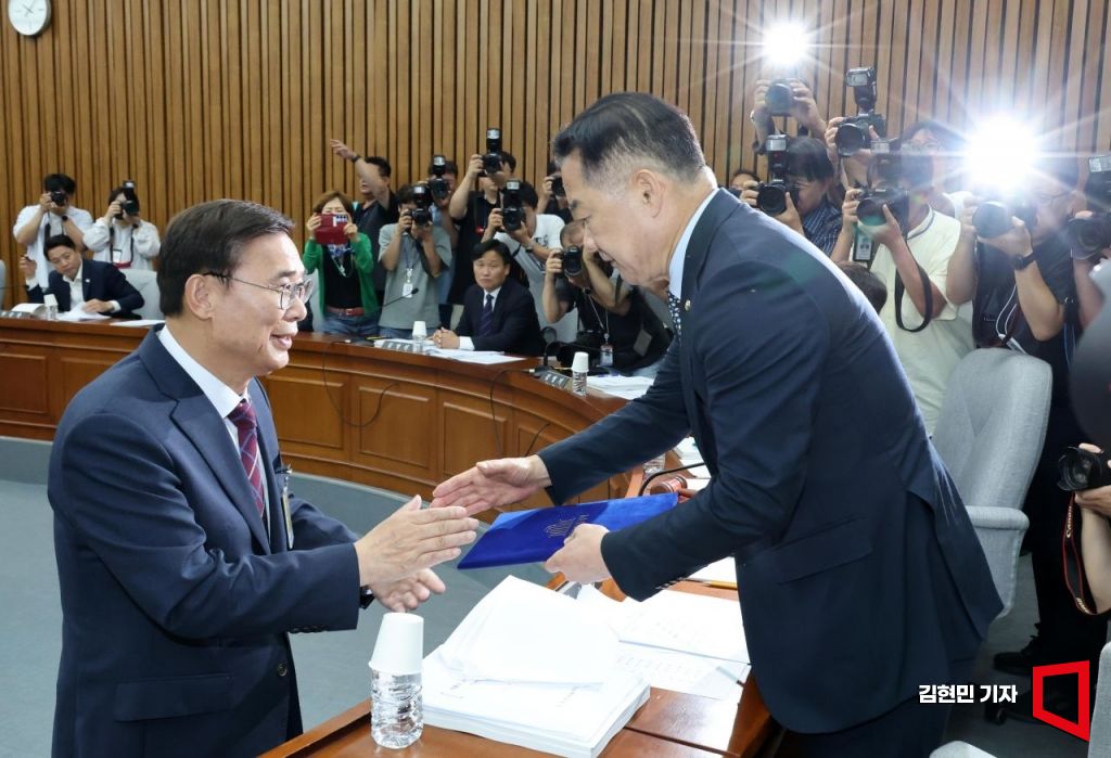 이종석 국가정보원장 후보자가 19일 국회 정보위원회에서 열린 인사청문회에서 신성범 위원장에게 선서문을 제출하고 있다.