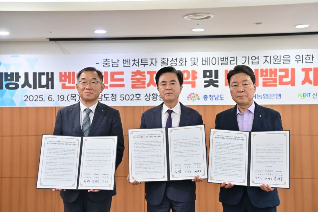 도는 19일 도청 상황실에서 김태흠 충남지사와 백남성 NH농협은행 부행장, 채병호 신용보증기금 상임이사 등이 참석한 가운데 '지방시대 벤처펀드 출자 확약 및 베이밸리 자금 협약식'을 맺었다.