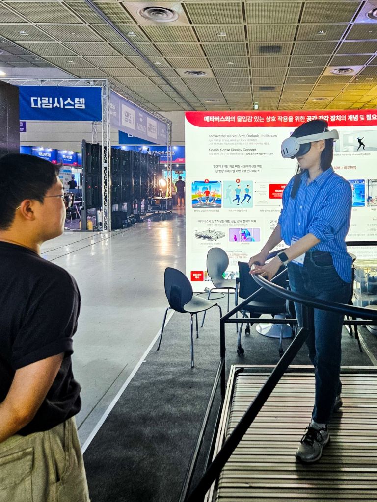관람객의 시선을 사로잡는 'Immersive Experience Zone'의 중심에는, 플랫폼 위에서 HMD(Head-Mounted Display)를 착용한 두 사람이 나란히 가상 공간을 걷는 독특한 장면이 펼쳐진다. 이는 단순히 가상 화면을 바라보는 수준을 넘어 실제 걷는 움직임에 기반한 몰입형 체험을 제공하는 차세대 보행 인터페이스 '전 방향 트레드밀'을 통해 구현된 장면이다.