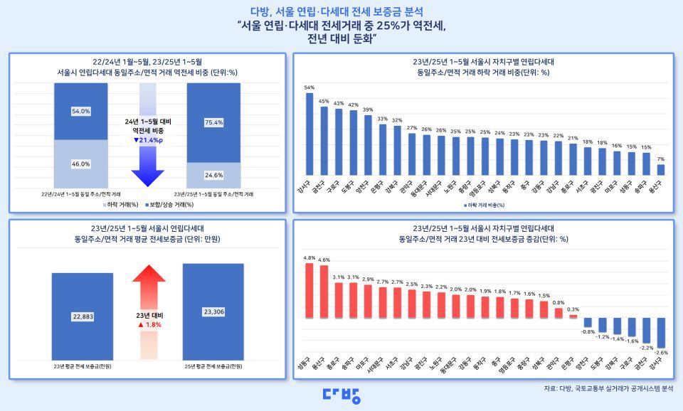 다방 관계자는 "지난 2023년부터 서울 연립·다세대의 역전세 거래를 지속 분석해 온 결과, 전세 시장에서 여전히 역전세 현상이 나타나고 있으나 거래 비중은 작년보다 다소 줄어든 것을 확인할 수 있었다"며 "지역에 따라 역전세 비중이나 전세가 하락 폭에 차이가 있는 만큼 향후 전세 시장 흐름을 면밀히 살펴봐야 할 시점"이라고 말했다.