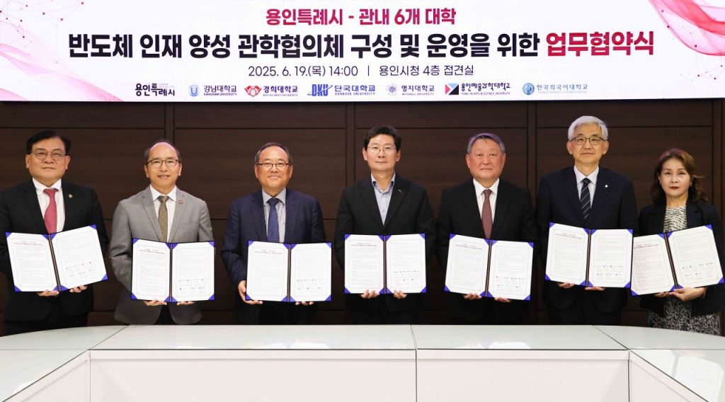 용인시는 19일 시청 접견실에서 관내 6개 대학과 '용인시 반도체 인재 양성 관학협의체' 구성을 위한 업무협약을 체결했다고 20일 밝혔다. 협약에는 강남대, 경희대, 단국대, 명지대, 용인예술과학대, 한국외국어대가 참여했다.