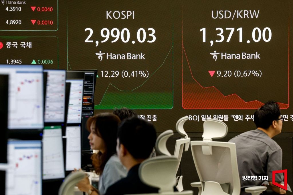 코스피 지수가 닷새째 오르며 2980선에서 출발한 20일 서울 중구 하나은행 본점 딜링룸에서 딜러들이 업무를 보고 있다.