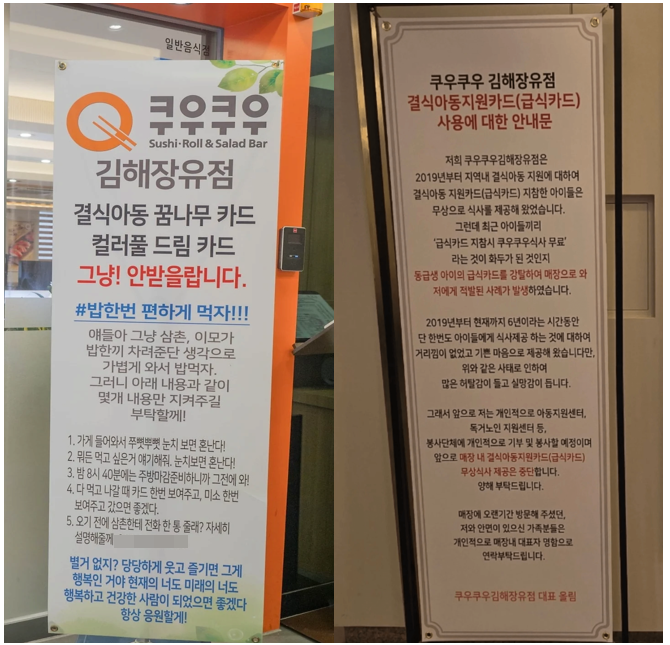 경남 김해시의 한 초밥 뷔페가 급식카드를 지참한 결식아동들에게 무료로 식사를 제공해왔으나 "더 이상 하지 않겠다"며 서비스를 중단했다. 아이들에게 식사를 제공하는 것에 대해 기쁜 마음으로 해 왔으나 급식카드 지참 시 식사가 무료라는 사실이 알려지자 동급생의 급식카드를 강탈해 매장으로 오는 경우가 확인되면서다.