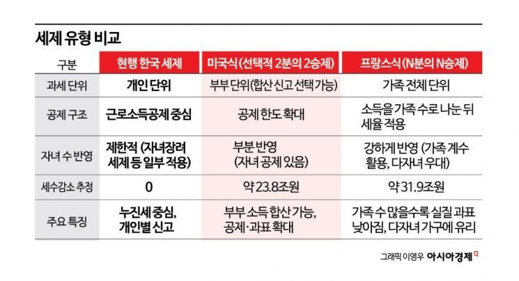 20일 관계부처에 따르면, 기획재정부는 이재명 대통령의 공약 이행 방안을 토대로 국정과제를 구체화하는 과정에서 가족친화적 소득세 개편안을 살펴보고 있다. 대통령 공약집에는 ▲혼인한 부부가 연말정산을 쉽게 할 수 있도록 ‘부부 단위 과세표준’ 신설 ▲부부의 소득과 자녀 수를 종합적으로 고려하는 과세 체계 전환 방안 마련이 명시되어 있다. 두 제도는 모두 출산과 결혼에 적극적인 인센티브를 제공하는 세금 과세 체계로 ‘부부 단위 과세표준 신설’은 미국식, ‘소득과 자녀 수를 종합적으로 고려하는 과세 체계’는 프랑스식 N분의 N승제(PAC)를 염두에 둔 구상이다.