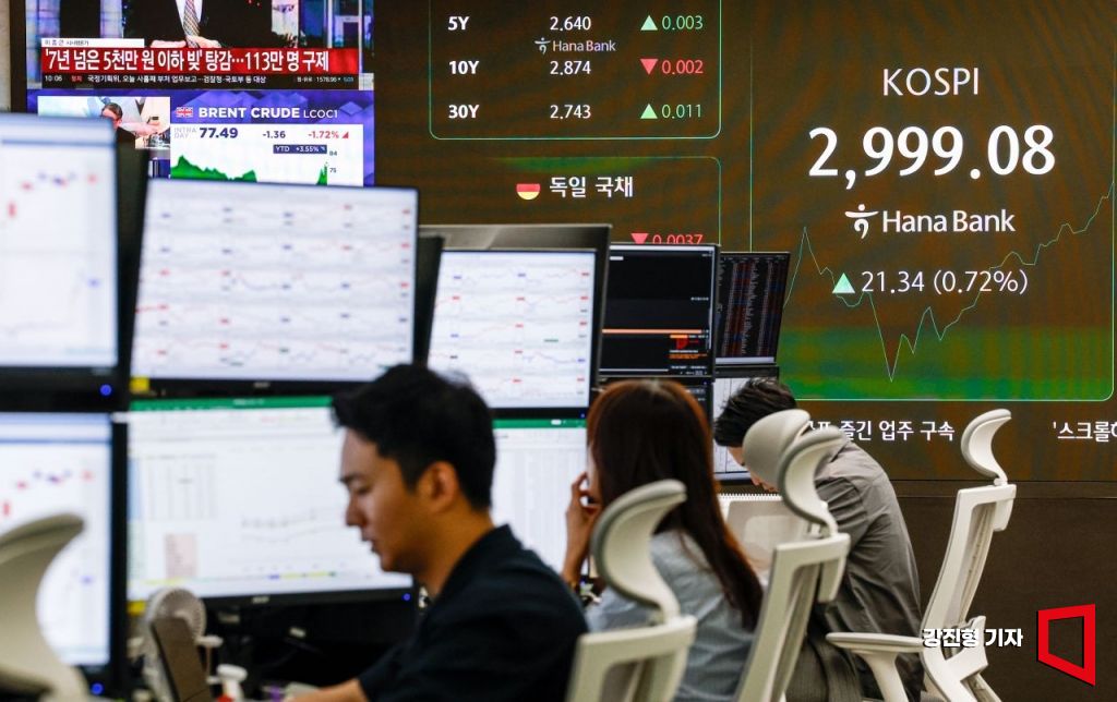 코스피 지수가 닷새째 오르며 2980선에서 출발한 20일 서울 중구 하나은행 본점 딜링룸에서 딜러들이 업무를 보고 있다.