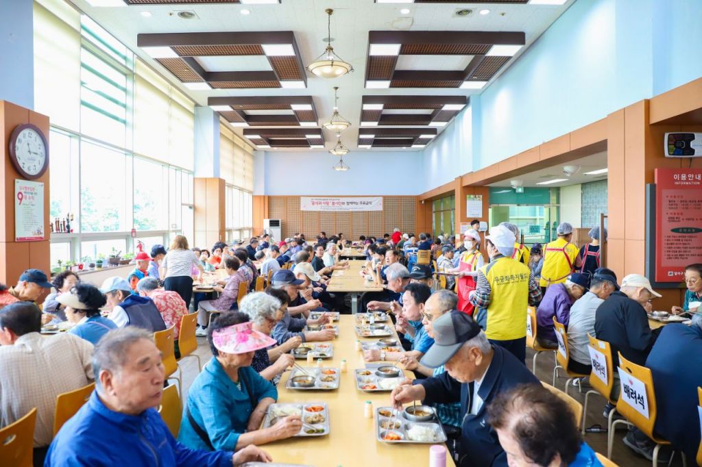 달서구노인종합복지관이 사랑의 한우국밥&불고기 나눔 데이 행사로 지역 어르신 1200여분께 식사를 대접하고 있다. 달서구노인복지관 제공