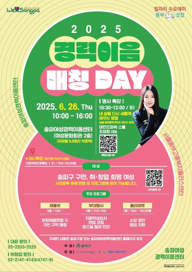 서울 송파구가 오는 26일 ‘송파여성경력이음센터’에서 경력단절(보유) 여성의 취·창업을 위한 ‘2025 경력이음매칭데이’를 개최한다.
