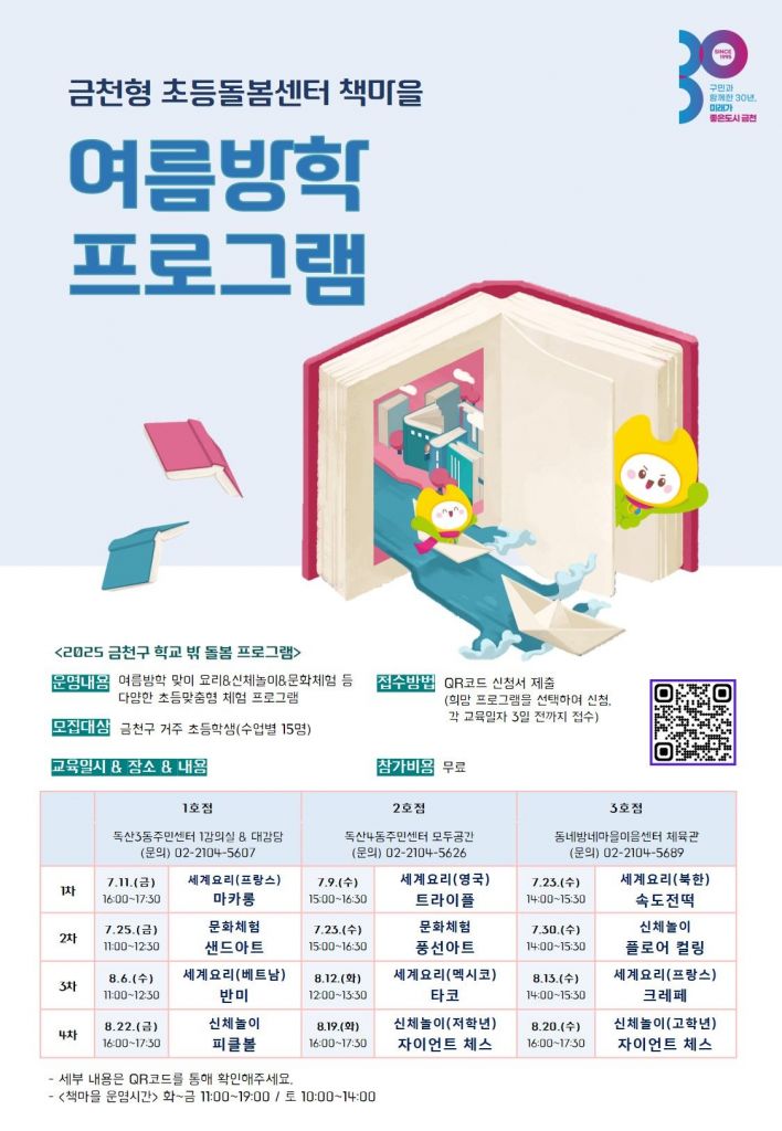 유성훈 금천구청장은 “돌봄 공백이 심화될 수 있는 여름방학 시기에 지역의 작은도서관에 있는 돌봄 공간 ‘책마을’을 활용해 다채로운 초등 프로그램을 운영하고 학교 밖 돌봄체계를 강화하겠다”고 전했다.