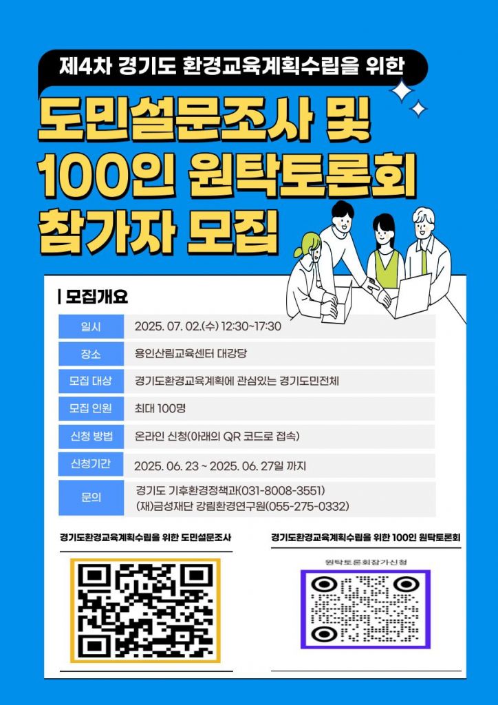 경기도가 향후 5년간 추진할 환경교육의 중장기 정책 방향과 전략을 모색하는 '제4차 경기도 환경교육계획(2026~2030)' 수립에 앞서 도민의 다양한 목소리를 반영하기 위해 이달 23~27일 온라인 설문조사, 다음 달 2일 '100인 원탁토론회'를 각각 진행한다.