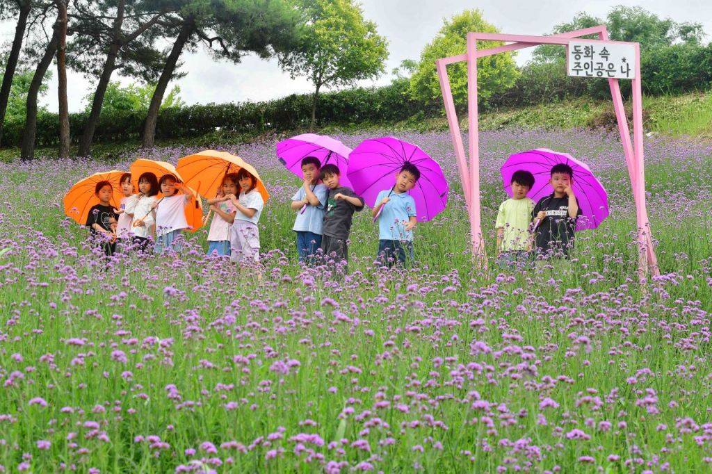 보랏빛 버베나꽃이 만개한 장성군 동화면 램프공원에서 아이들이 형형색색 우산을 들고 즐거운 추억을 쌓고 있다. 장성군 제공