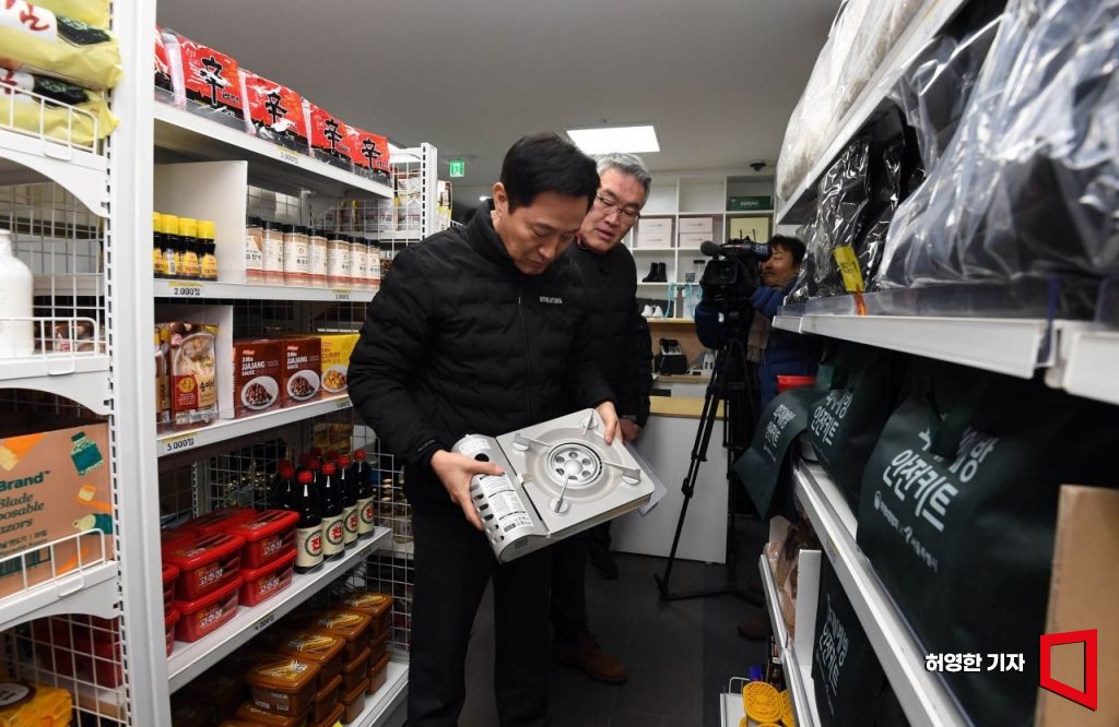 지난해 오세훈 서울시장이 종로구 돈의동 쪽방촌 온기창고를 찾아 물품을 점검하는 모습. 아시아경제 DB