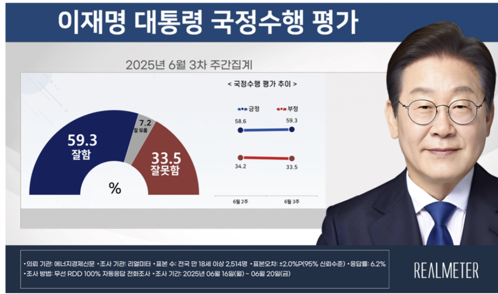 23일 리얼미터가 공개한 여론조사(에너지경제신문 의뢰로 16일부터 20일까지 18세 이상 유권자 2514명을 대상으로 무선 100% 자동응답 방식으로 조사, 표본오차는 95% 신뢰수준에 ±2.0%포인트, 응답률은 5.6%)에 따르면 이 대통령의 지지율은 지난주보다 0.7%포인트 오른 59.3%를 기록했다. 부정평가는 0.7%포인트 내린 33.5%였다.