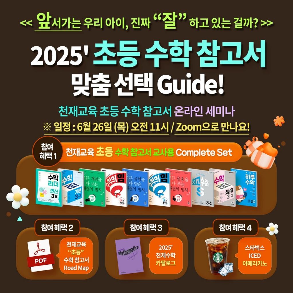 천재교육은 오는 26일 '초등 수학 참고서 맞춤 선택 가이드' 온라인 세미나를 개최한다고 23일 밝혔다. 천재교육
