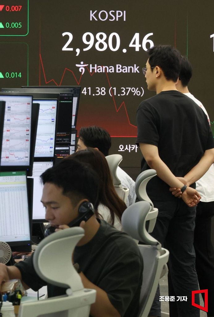 미국의 이란 공습에 따라 중동리스크가 커지고 있는 가운데 코스피 지수가 장중 3000선이 무너진 23일 서울 중구 하나은행 딜링룸 현황판에 코스피지수와 원/달러 환율이 표시되고 있다. 이날 코스피 지수는 전 거래일 대비 0.98% 내린 2,992. 83포인트(0.24%) 장을 시작했다.