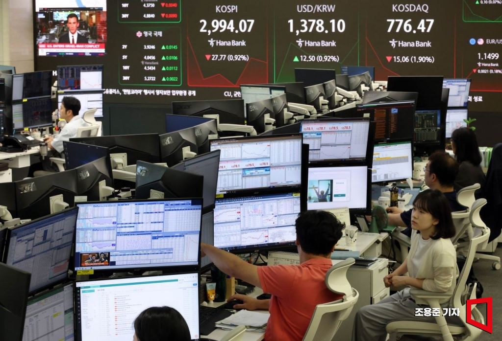 미국의 이란 공습에 따라 중동불안이 커지고 있는 가운데 코스피 지수가 장중 3000선이 무너진 23일 서울 중구 하나은행 딜링룸 현황판에 이란 관련 뉴스가 나오고 있다. 이날 코스피 지수는 전 거래일 대비 0.98% 내린 2,992. 83포인트(0.24%) 장을 시작했다.