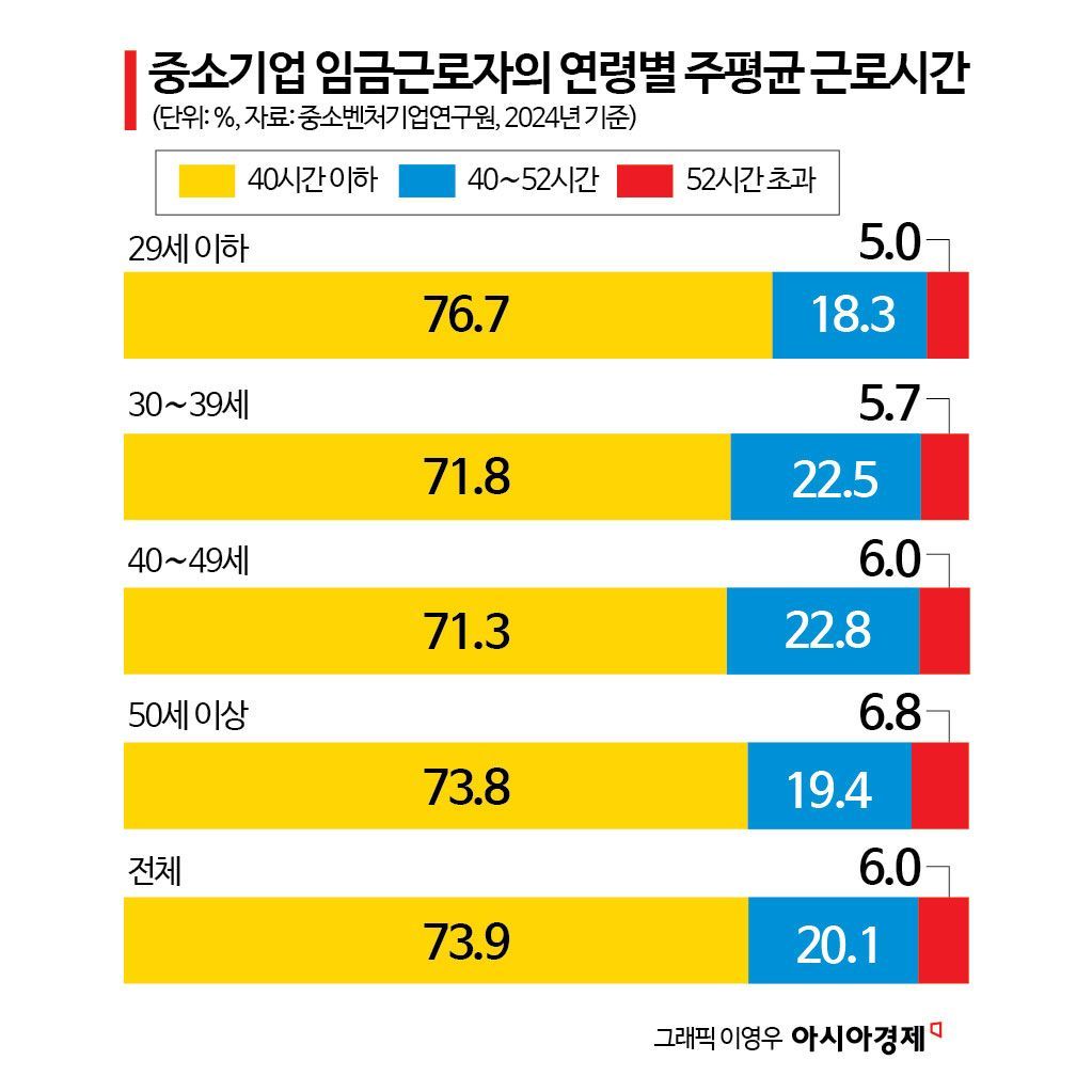 주 40시간 이하로 근로하는 비중은 2014년 45.6%에서 2024년 73.9%로 28.3%포인트 높아졌다. 29세 이하 청년 근로자는 타 연령대 대비 주 40시간 이하 비중이 76.7%로 가장 높고, 주 52시간 초과 비중은 5.0%로 가장 낮게 나타났다. 주 52시간으로 강제하지 않더라도 중소기업에서도 근로시간은 계속해서 감소하고 있었고, 특히 젊은 세대일수록 그 경향이 뚜렷해진다는 의미다.