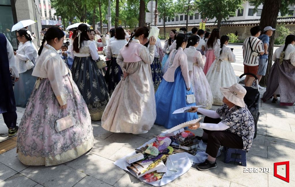 강렬한 햇빛을 막아주거나 시원한 바람을 만들어주는 부채는 여름철 필수템이라 할 수 있다. 경복궁 인근에서 한 상인이 무더운 날씨에도 한복을 입고 고궁을 찾는 외국인 관광객들게 부채를 팔고 있다.