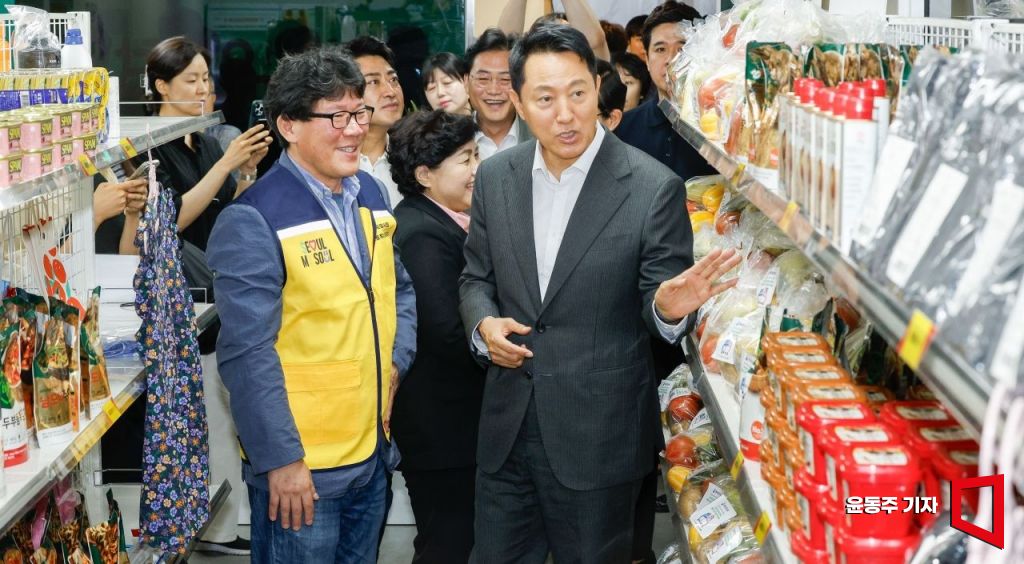 오세훈 서울시장이 23일 서울 영등포구 쪽방촌에서 '온기창고 3호점)' 개소식에 참석, 온기창고를 둘려보고 있다. 온기창고는 매장에 후원받은 생필품을 진열해 놓고 쪽방주민 개인이 배정받은 적립금 한도 내에서 필요할 때 물품을 선택해 가져가는 방식으로 운영된다.