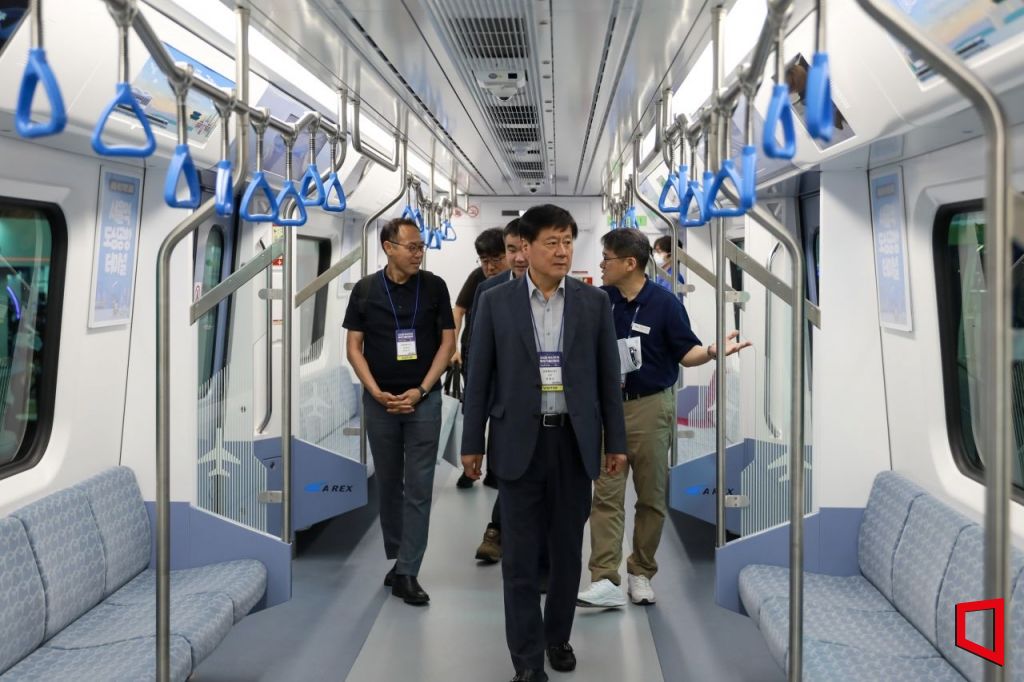 박대수 공항철도 사장이 '2025 부산국제철도기술산업전'에 전시된 신규 전동차 내부를 둘러보고 있다. 공항철도