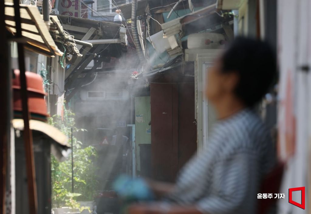 23일 서울 영등포구 쪽방촌 거주민이 쿨링포그로 더위를 식히고 있다. 2025.06.23