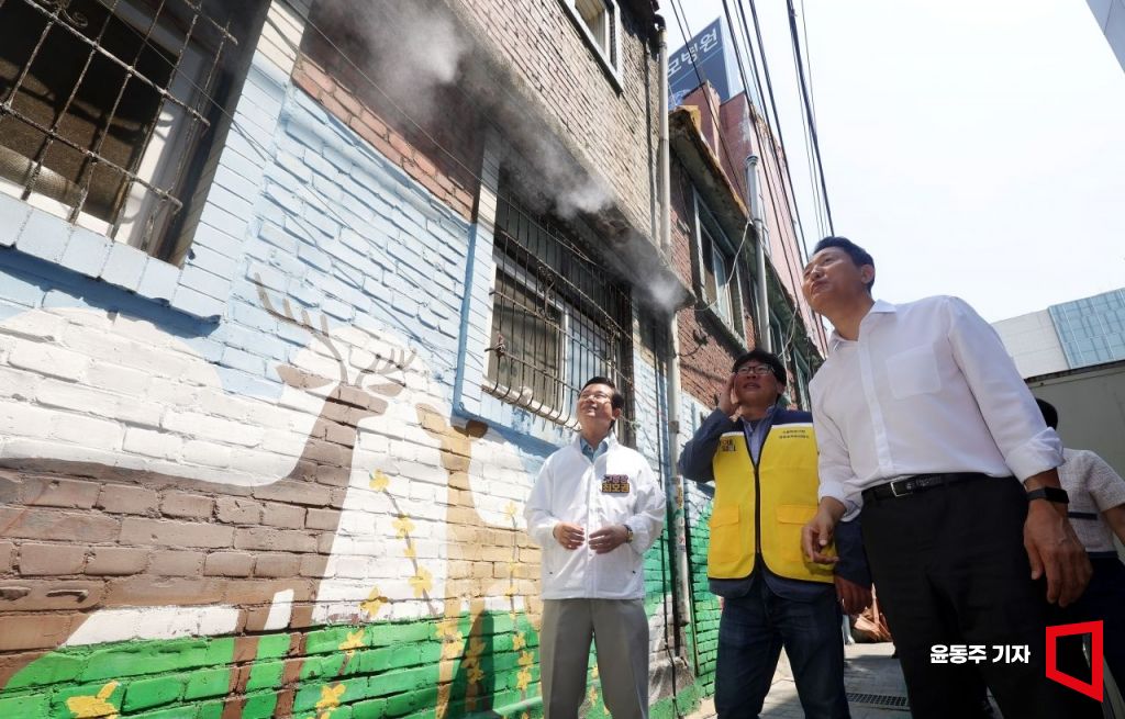 오세훈 서울시장이 23일 서울 영등포구 쪽방촌을 찾아 쿨링포그 작동 상태를 보고 받고 있다. 오 시장은 취약가구 폭염대책 점검차 쪽방촌을 찾았다.